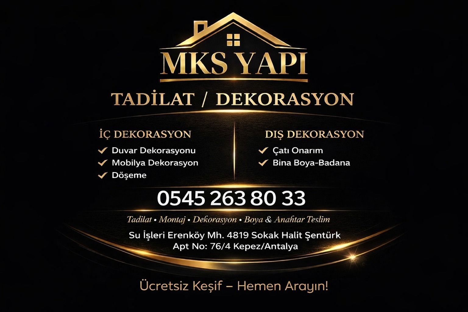 Firmamız, dekorasyon öncesi ücretsiz keşif yaparak alan ölçülerini çıkarır, kullanılacak malzemeleri belirler ve müşteriye net fiyatlandırma sunar. Böylece Konyaaltı bölgesindeki evler, ofisler, butik işletmeler ve yazlık daireler hem modern hem de uzun ömürlü çözümlerle yenilenmiş olur.